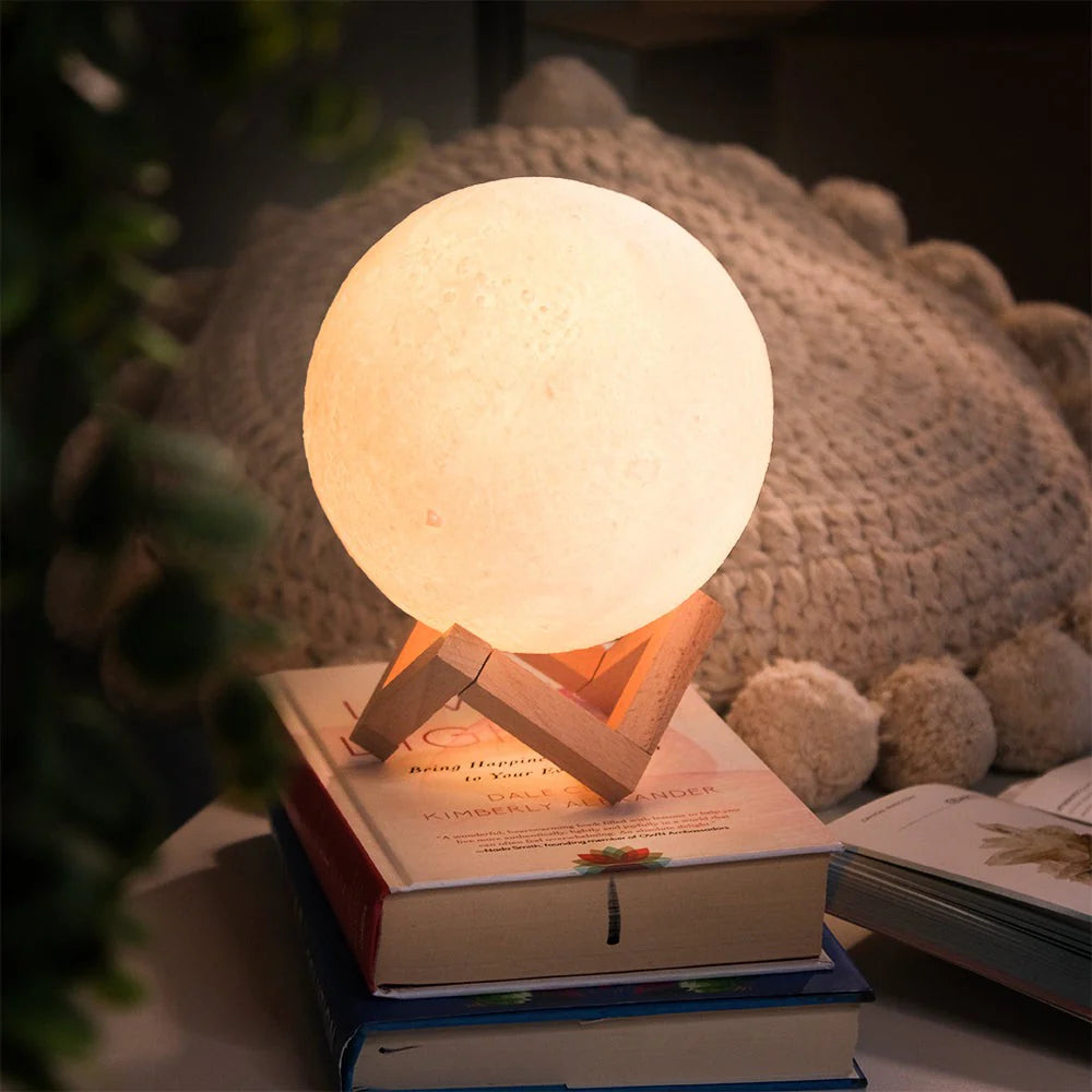 Lampa Lună pe stativ transformă serile în momente cozy, cu lumina ei caldă și culorile care se schimbă după preferință.